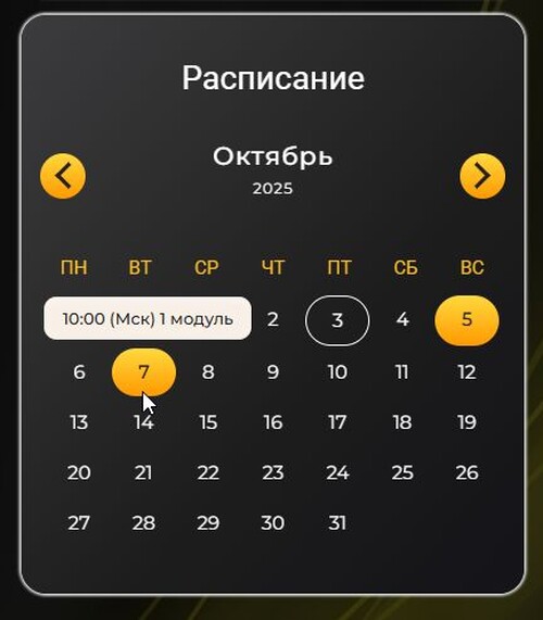 - Имеет фильтр отображения всего доступного расписания или тренинга в котором установлен. При использовании фильтра потягивается расписание начиная от тренинга в котором стоит календарь и всех его подтренингов.
