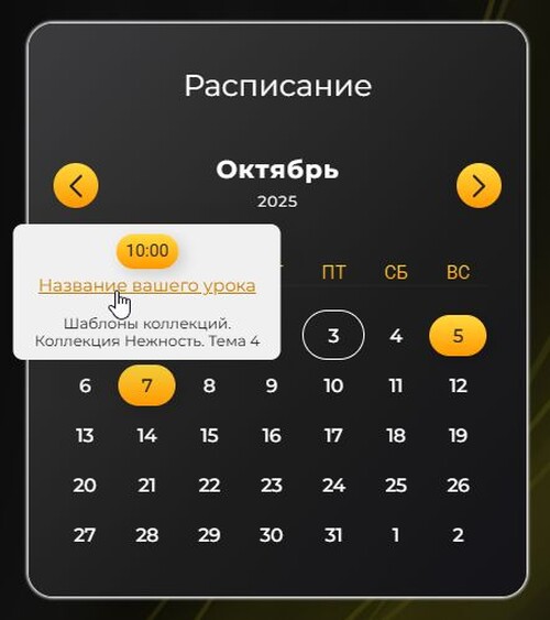 - В всплывающей подсказке отображается время, название тренинга где будет событие и кликабельное название урока.