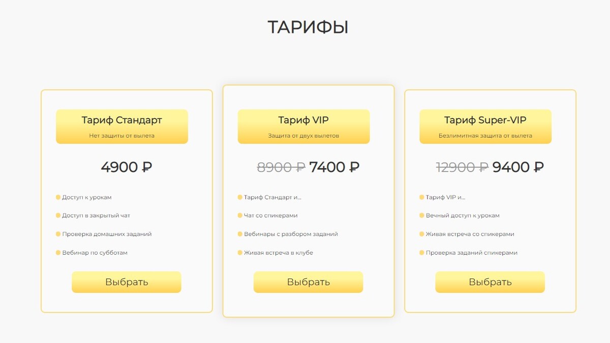Тарифы «Золотая коллекция» эффектно смотрятся на любых фонах, а их нестандартное исполнение разнообразит ваш лендинг и привлечет внимание покупателей.